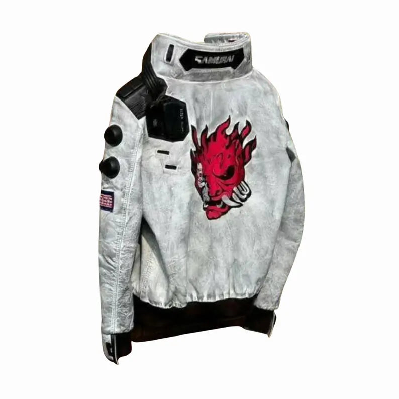 Cyberpunk 2077 White Waxed Leather Jacket – LED Collar, Samurai Embroidery